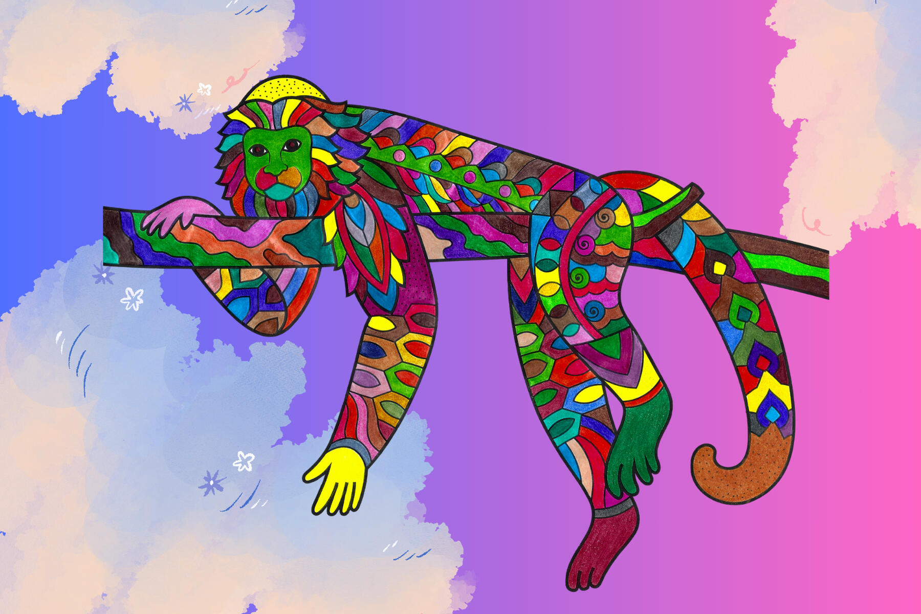 This is Milo the Monkey, the king of chilling out. While all the other monkeys raced around, swinging from vine to vine, Milo preferred to take it slow, lounging on his favorite branch and soaking in the colors of the jungle. One day, a big storm came, and all the animals were in a rush, scrambling to find shelter. But Milo stayed calm, chilling on his branch, and soon the storm passed, leaving a beautiful rainbow in the sky. Milo’s friends learned that sometimes, just taking it easy and staying calm can help you weather any stormQuestion: