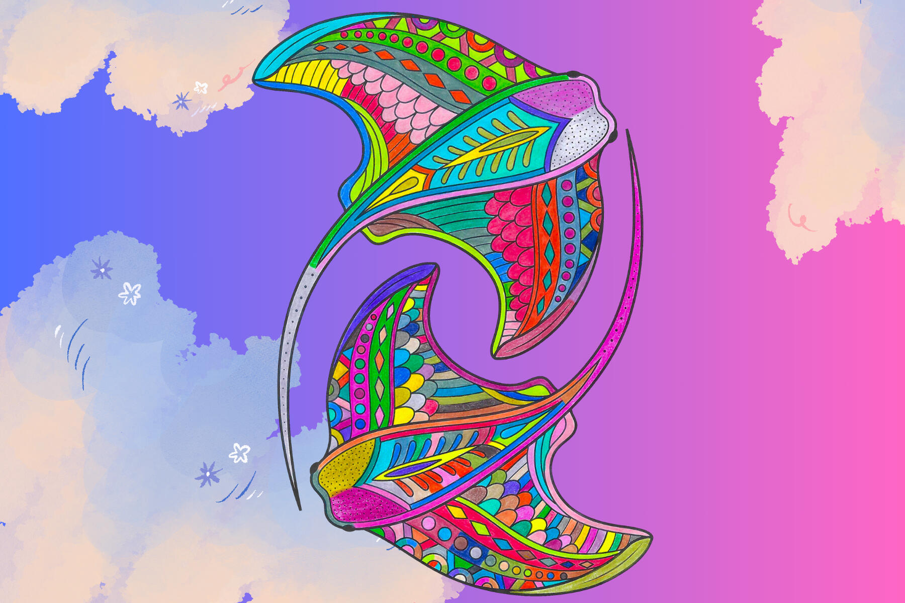 This is Ray and Rae, two colorful manta rays known for their dazzling moves. They loved to dance through the ocean, side by side, exploring the deep blue sea.