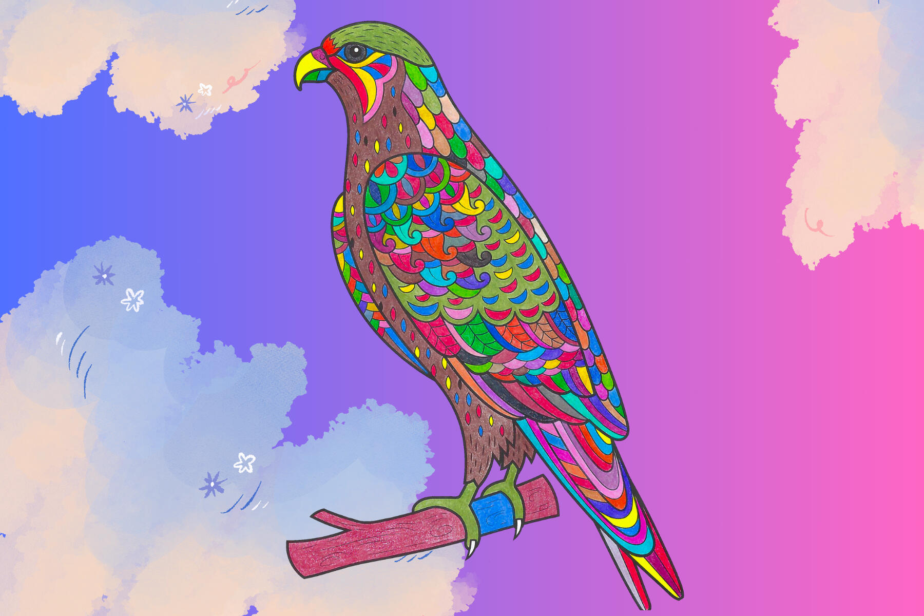 This is Ovo, a colorful and wise hawk who watched over the bustling city from her perch on the tallest building. Ovo loved to soar high above, keeping an eye on everything below and making sure everyone was safe. One day, during a busy afternoon, Ovo spotted a young boy who had accidentally dropped his bright red balloon, watching helplessly as it floated higher and higher. With a swift dive, Ovo soared through the sky, using her sharp eyes and colorful feathers to attract attention as she grabbed the balloon string in her beak, bringing it back to the delighted boy. The boy waved up at Ovo in gratitude, and from that day on, Ovo was known as the city's quiet guardian, always ready to lend a wingQuestion: