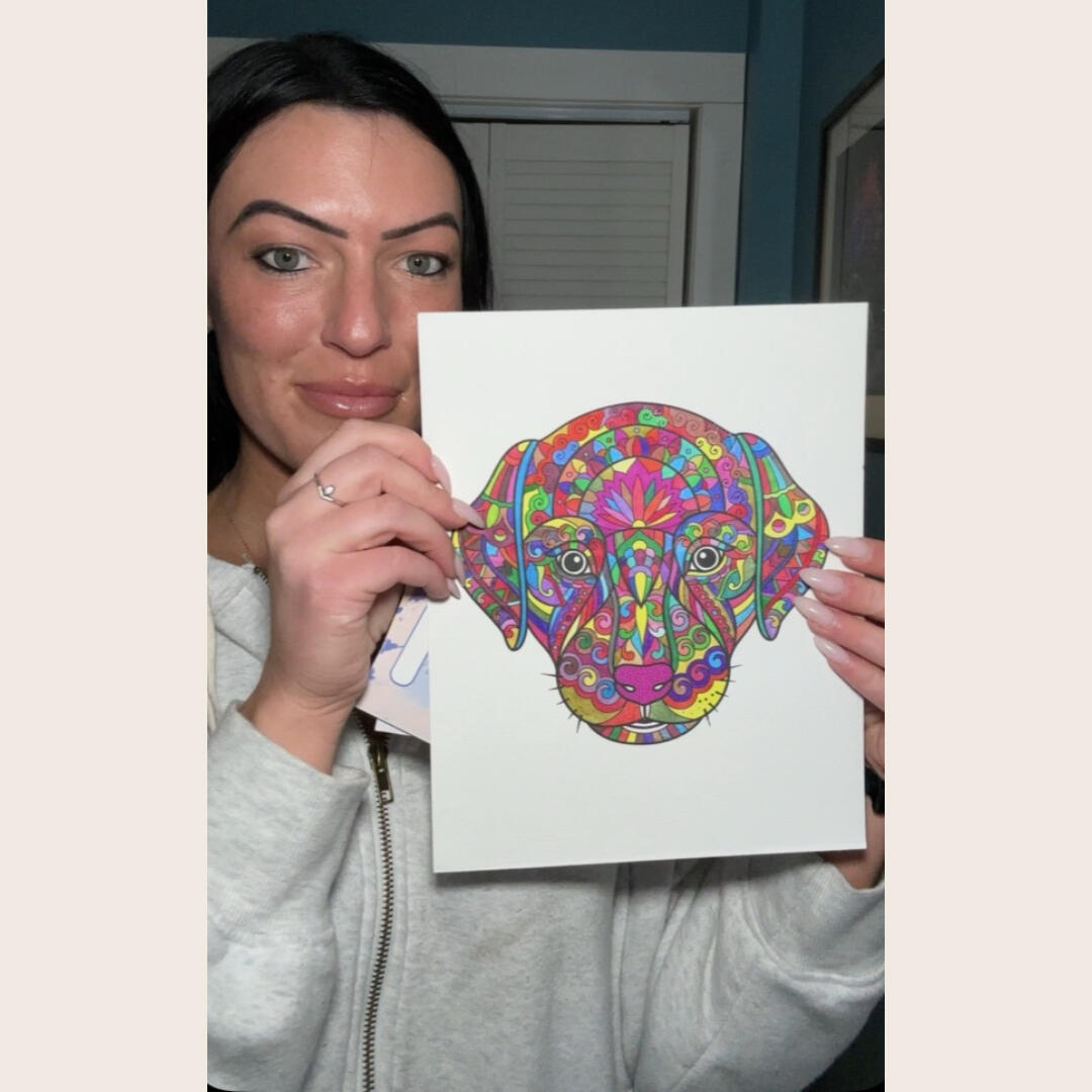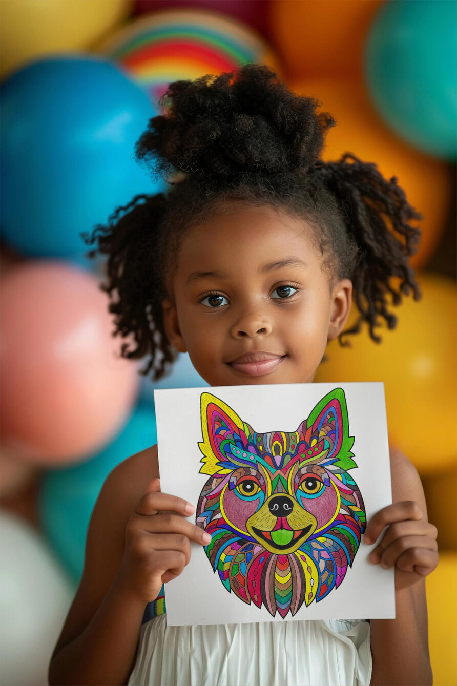 This is Bazelle, a curious and colorful dog who lived in a small, cozy town. Bazelle loved exploring the neighborhood, especially on market days when the streets were filled with people, laughter, and vibrant stalls. One day, Bazelle noticed a little girl sitting alone, looking sad and lost among the crowds. With her colorful fur and friendly eyes, Bazelle trotted over and gave the girl a nudge, her bright colors making the girl smile. Bazelle stayed by her side until her parents found her, and the girl hugged Bazelle tightly, whispering, “Thank you.” From that day on, Bazelle became known as the town’s gentle hero, always bringing comfort and joy wherever her colorful presence was needed.Question: