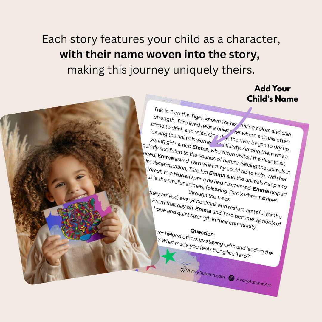 This is Taro the Tiger, known for his striking colors and calm strength. Taro lived near a quiet river where animals often came to drink and relax. One day, the river began to dry up, leaving the animals worried and thirsty. Taro, with his calm determination, started leading the animals to a hidden spring he’d discovered deep in the forest. His vibrant colors guided the way, and soon, all the animals were refreshed and thankful. From then on, Taro became the symbol of hope and strength in their community.Question: